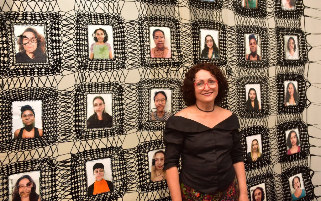 Entre as peças apresentadas está “Eu tenho a tua cara”, instalação composta por 49 fotografias de mulheres nas quais olhos e bocas foram recortados, trocados e costurados. A intervenção cria um efeito de estranhamento e convida o público a refletir sobre identidade e violência de gênero.